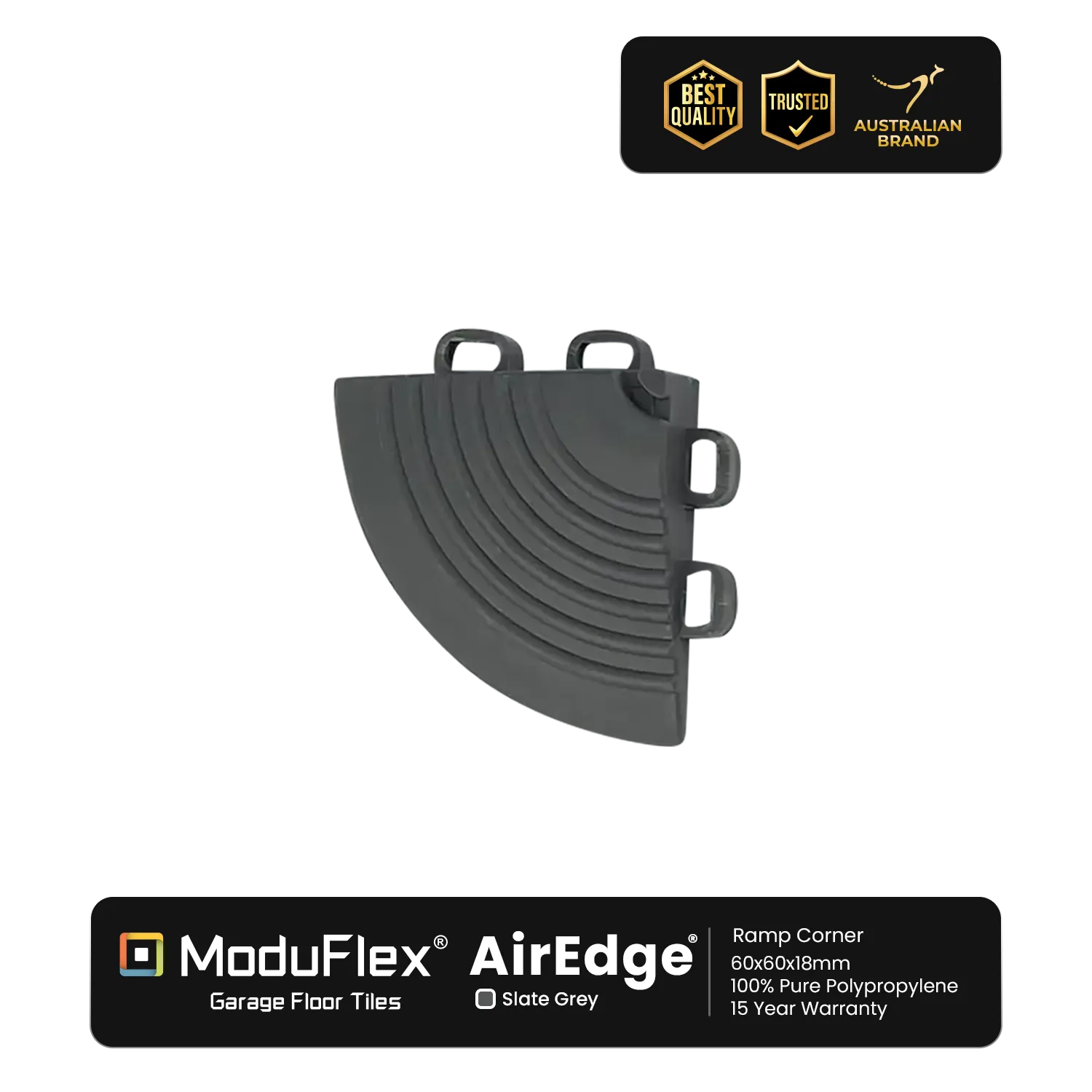 Effortlessly complement your flooring with ModuFlex AirEdge Ramp Corners. They snap onto the tiles, providing a smooth and cohesive transition for ramps and entryways.
